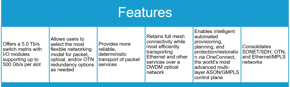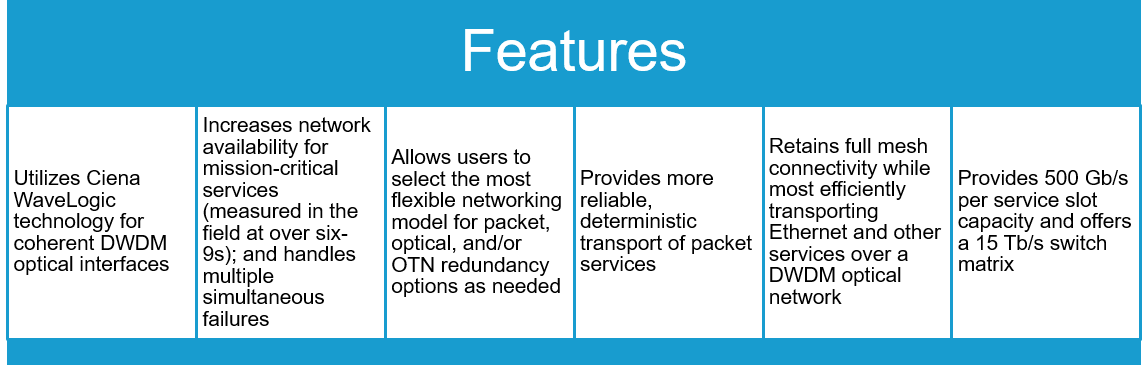 The 5400 Family is optimized for cost-effective, next-generation bandwidth management, enabling efficient aggregation, grooming, and forwarding of multiple traffic types. Both the 5410 and 5430 systems employ Ciena’s intelligent control plane—shared with the 6500 Family—to automate labor-intensive operations including planning, provisioning, and topology and inventory management. The 5400 Family enables the highest availability networks—measured in the field at over six-9s—for mission-critical services.