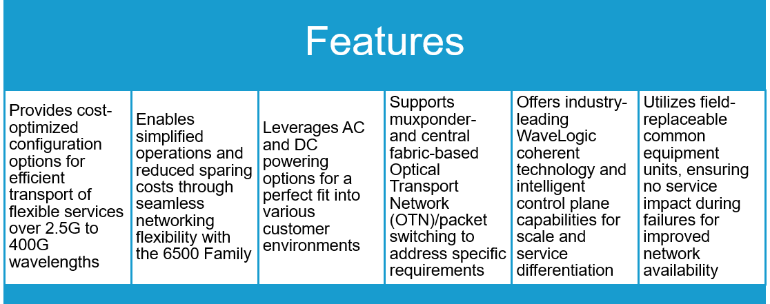 Designed for modernized network applications, the 6500-D7/S8 configurations converge comprehensive Ethernet, TDM, and WDM capabilities with packet/OTN switching and an intelligent control plane for cost-effective delivery of services.