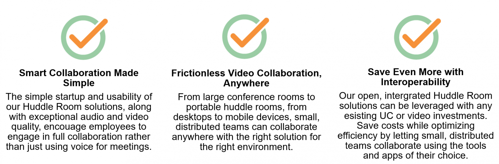 In business life, grabbing a quick, impromptu meeting keeps work humming. Our all-in-one meeting solution is perfect for bringing together a small team of people from different locations. It’s huddle time!Turn Meeting Spaces into Intelligent Collaboration Rooms Leverage the power of high-quality collaboration solutions designed for small, distributed teams. Empower workers with a flexible, all-in-one strategy that meets their specific needs, challenges, and goals. |
