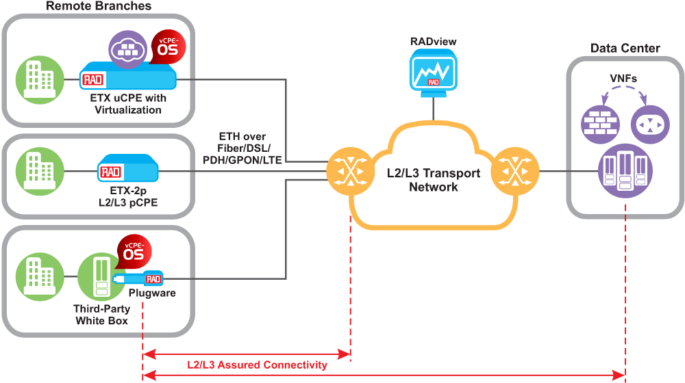 Flexible virtualization of business CPE functionalities across access, aggregation and core domains.