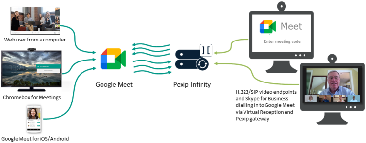 Pexip automatically transcodes all the popular video and audio codecs and supports standard protocols including SIP, H.323, and WebRTC.