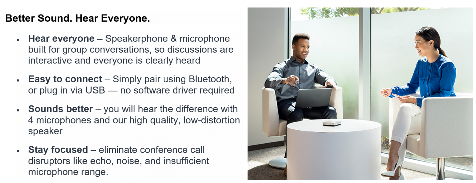 Poly VoxBox is the new high-performance speakerphone for your conference call needs. Now you can experience Poly’s legendary conference quality anywhere, anytime, and with more devices. VoxBox combines a modern, portable design with Bluetooth wireless pairing and USB connectivity and packs it with Polycom HD Voice quality. You’ll hear the crisper sound and your colleagues won’t have to lean in to hear or be heard. Poly NoiseBlock is a noise reduction technology that automatically mutes the microphone when you stop speaking, silencing noises that can interrupt the conversation.