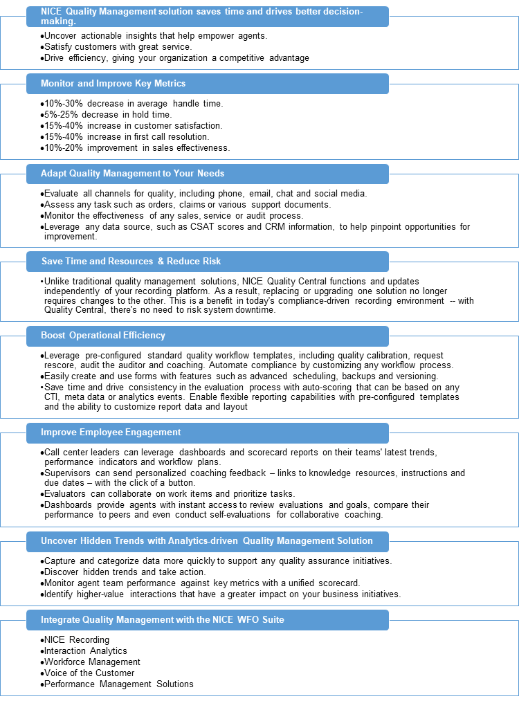 NICE Quality Central™ gives you a single, holistic approach to quality management, ensuring that all interactions and transactions are closely monitored and that performance metrics are closely tied to top-priority objectives. Available on-premise or in the cloud, Quality Central automates and customizes all of your quality processes in a single application, regardless of the data source, channel or recording solution.